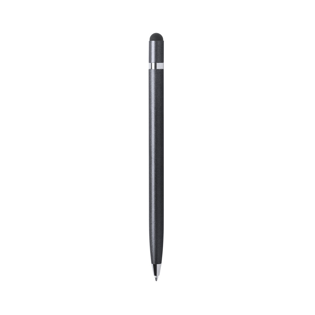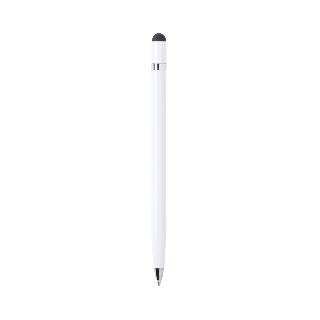Dreh-Kugelschreiber mit Stylus aus Aluminium mit geschmeidigem Metallic-Finish und verchromtem Ring. Erhältlich in Gold, Rosa und Silber in glänzender Ausführung sowie Weiß in matter Ausführung. Blaue Tinte.