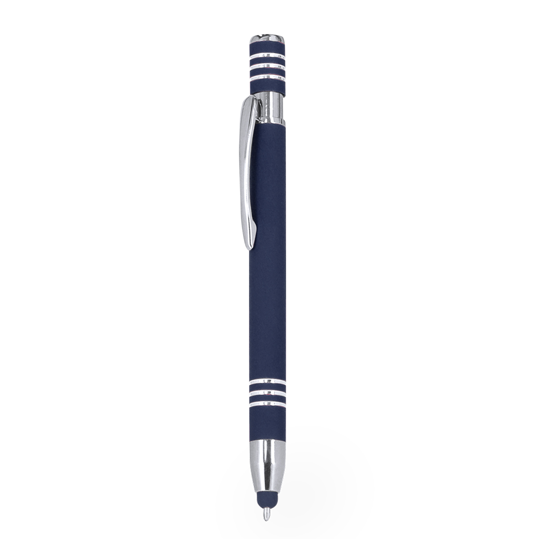 Kugelschreiber mit Druckmechanismus und Stylus, aus Aluminium. Gummierte Oberfläche, speziell für Lasergravur entwickelt, die das Logo in Silberton enthüllt. Verchromte Beschläge und passender Clip inklusive. Blaue Tinte.