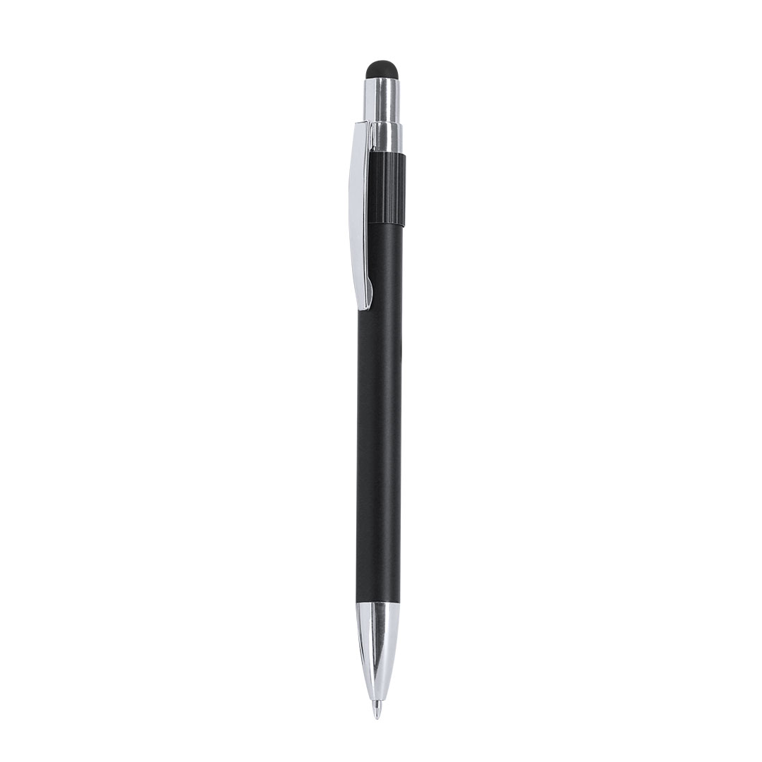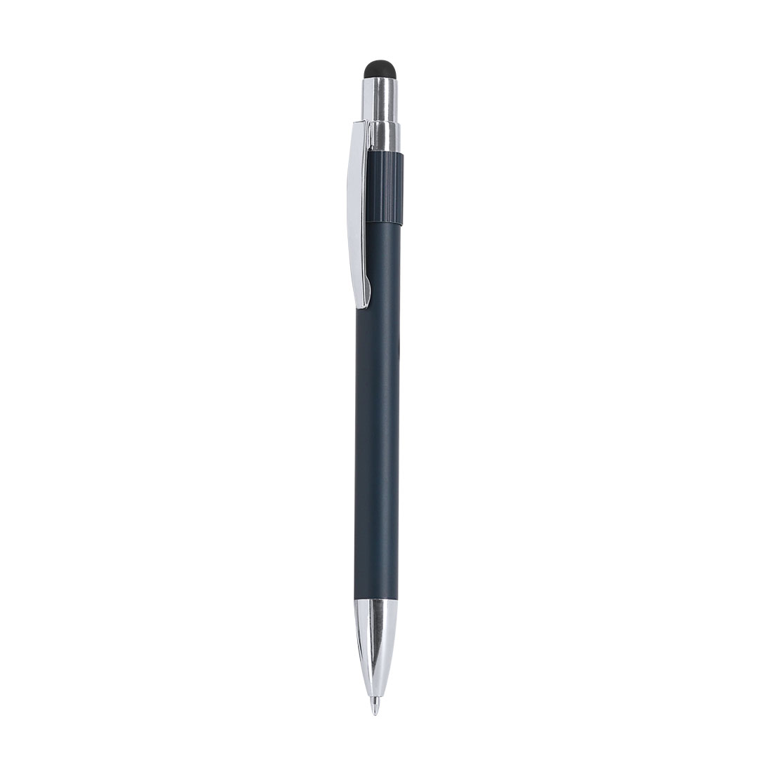 Eleganter Zeigestift aus recyceltem Aluminium. Mit mattem Druckknopfmechanismus und Zeiger oben in Schwarz, in blauer Tinte. Clip und Zubehör in Chromlack. Beinhaltet ein Antistress-Spinner-System. Mit Logo von recyceltem Aluminium graviert.