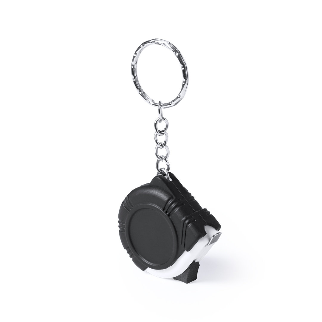 Schlüsselanhänger mit 1 m langem Metallmaßband mit Verriegelungsmechanismus. Maßangabe in Zentimeter, Zoll und Fuß. Mit spezieller Stanzung zum Bedrucken.