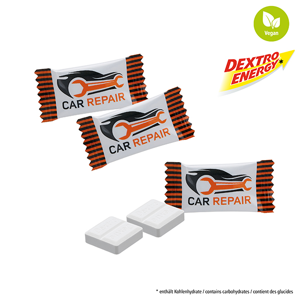 MINI-DEXTRO ENERGY* Traubenzucker in glänzend- oder matt-kaschiertem transparentem alternativ weißem Flowpack einzeln verpackt. *enthält Kohlenhydrate