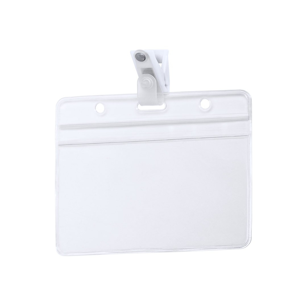 Gestanzter Ausweishalter aus PVC mit Befestigungsclip in Weiß. Erhältlich in horizontaler und vertikaler Ausführung.