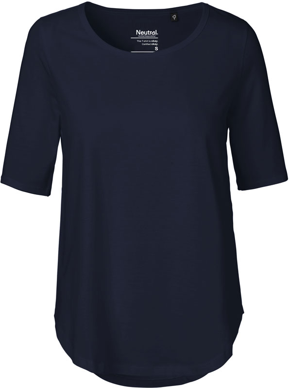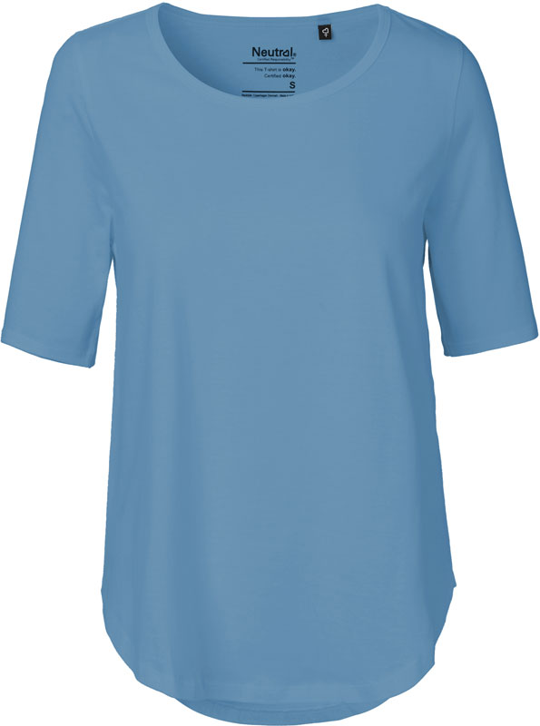 Damen T-Shirt, Breiter Rundhalsausschnitt, Nackenband, ellbogenlange Ärmel, abgerundeter Saum unten, 40° waschbar, trocknergeeignet bei niedriger Temperatur, Material: 155g/m², 100% gekämmte ringgesponnene zertifizierte Bio-Baumwolle, Fair Trade, Single Jersey, Größen: XS,S,M,L,XL,XXL