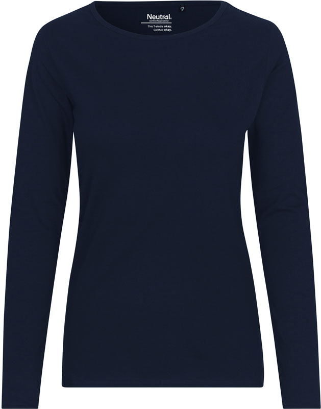 Damen T-Shirt langarm, Leicht taillierter Schnitt, 2-fach gelegter Rundhalsausschnitt, Nackenband, 40° waschbar, trocknergeeignet bei niedriger Temperatur, Material: 155g/m², 100% gekämmte ringgesponnene zertifizierte Bio-Baumwolle, Fair Trade, Single Jersey, Größen: XS,S,M,L,XL,XXL