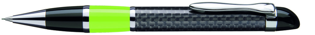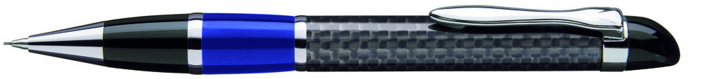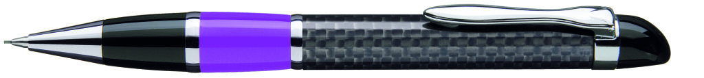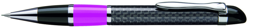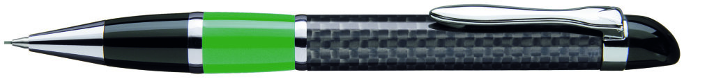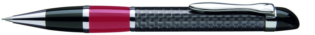 Edler Carbonfaser Metalldrehbleistift (0,7mm) mit farbige Griffzone, flexiblem Metallclip, Metallzierring und Metallspitze glanzverchromt.
