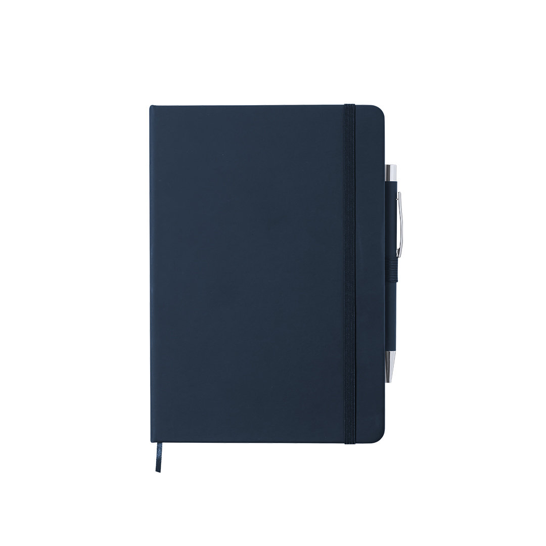 Zueinander passendes Set aus Notizblock und Kugelschreiber. Notizbuch mit festem Einband und Soft-Touch-Kunstlederoberfläche, mit Stifthalter, Lesezeichen und elastischem Verschluss, mit 100 linierten Blättern. Aluminium-Kugelschreiber mit gummierter Oberfläche und Jumbo-Mine. Erhältlich in einer Reihe von Farben.