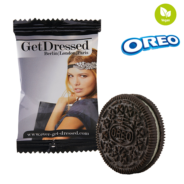 Knuspriger Kakaokeks mit einer Cremefüllung mit Vanillegeschmack (29%), in glänzend- oder matt-kaschiertem weißem Flowpack einzeln verpackt. Bruch einzelner Kekse möglich.
