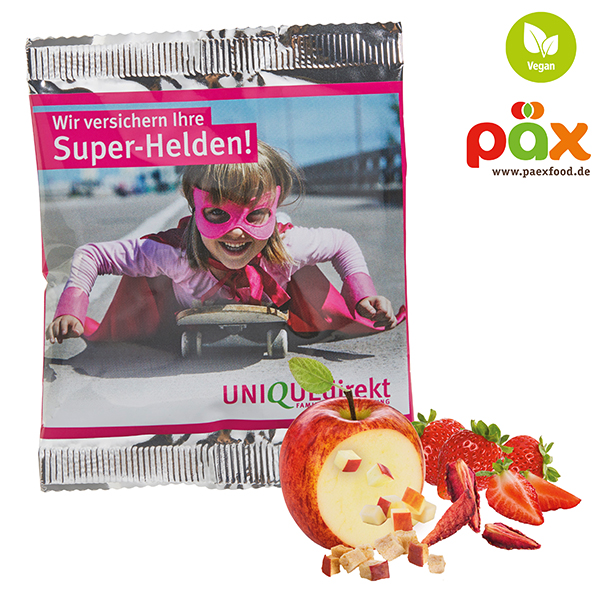 Knusprig getrockneter Frucht-Mix mit natürlich intensivem Geschmack ohne jegliche Zusätze, in glänzend- oder matt-kaschiertem alubedampften Werbetütchen verpackt. Solange Vorrat reicht.