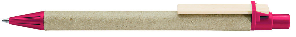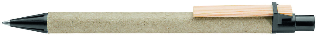 Druckkugelschreiber aus recycelter, naturfarbener Pappe. Spitze und Drücker unifarben aus recyceltem oder biologisch abbaubarem Kunststoff (*06-7527 Bio-Mix) sowie Holzclip. Minenfarbe: blau