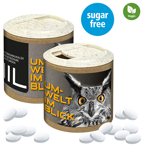 Kraftpapierdose mit kompostierbarem Kunststoffdeckel, ohne Sleeve, mit rundum laufendem Werbeetikett. Einfach den Originalverschluss unter dem verschiebbarem Wiederverschlussdeckel eindrücken – und den leckeren Inhalt genießen.