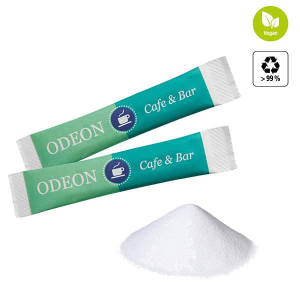 Weißzucker im Papierwerbetütchen verpackt.