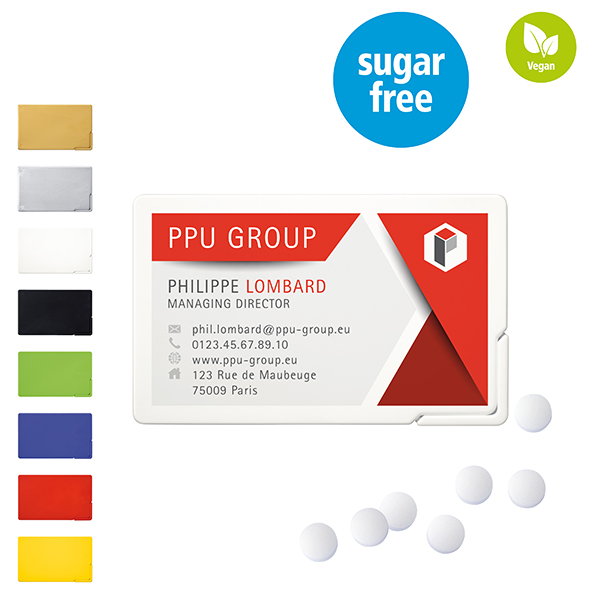 Kunststoff Pfefferminz-Karte mit Öffnungsklappe über Eck, befüllt mit zuckerfreien Pfefferminzpastillen, wiederbefüllbar, in 8 verschiedenen Farben.