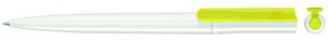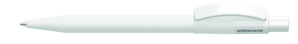 Druckkugelschreiber mit antibakteriell wirkendem Kunststoffgehäuse in weiß matt, Bogenclip und Drücker. Der nach ISO 22196:2011 geprüfte antimikrobielle Zusatz aus Silberionen verleiht dem Kunststoff eine antibakterielle Wirkung, die eine Haftung und Ansiedlung von Bakterien oder Krankheitserregern auf der Oberfläche des Schreibgerätes um 99,99% verringert. Der verarbeitete Kunststoff ist nicht nur antibakteriell, sondern auch schadstofffrei und umweltverträglich und entspricht den europäischen Lebensmittelrichtlinien, sowie der amerikanischen FDA. Minenfarbe: blau