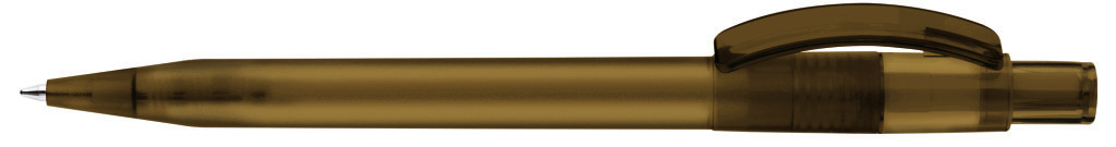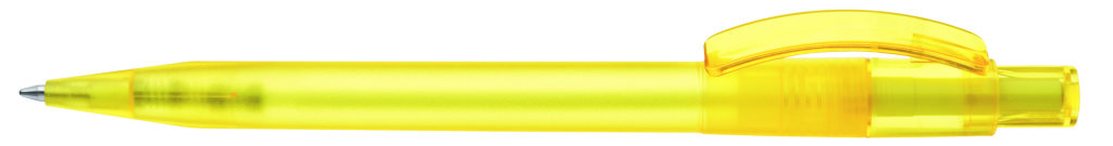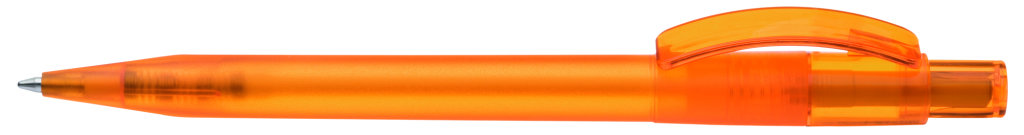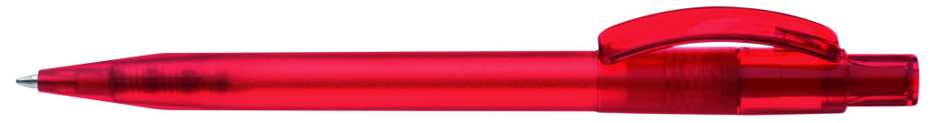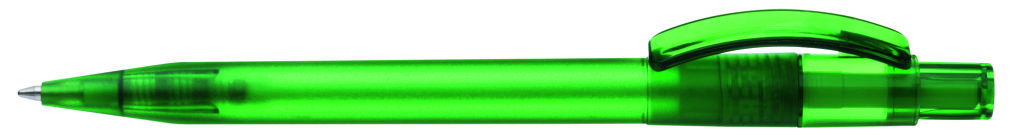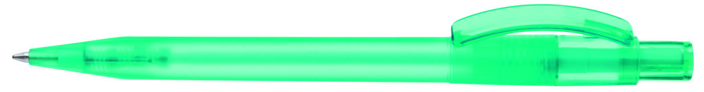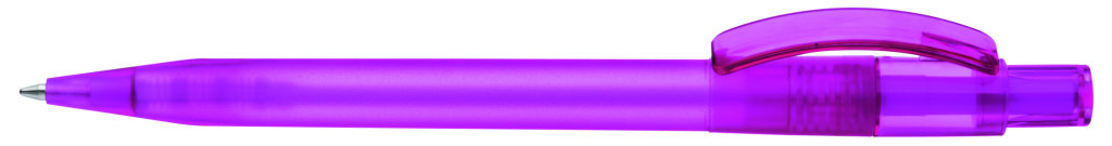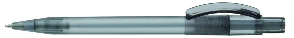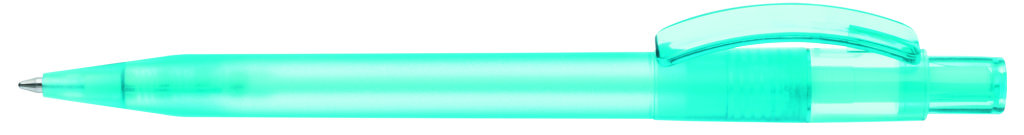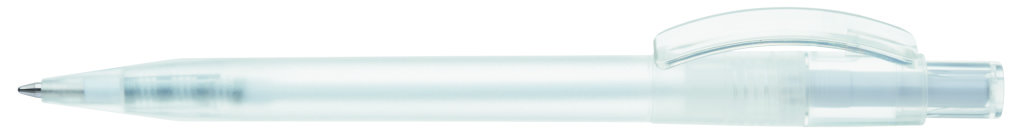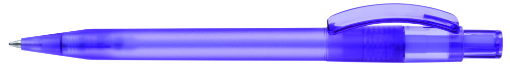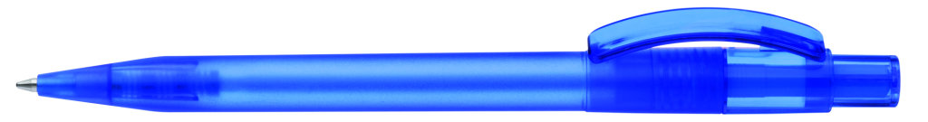 Druckkugelschreiber mit gefrostetem Gehäuse, glänzend transparentem Bogenclip und Drücker. Minenfarbe: blau