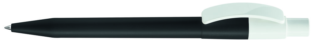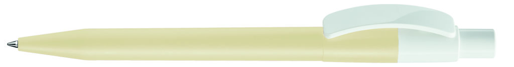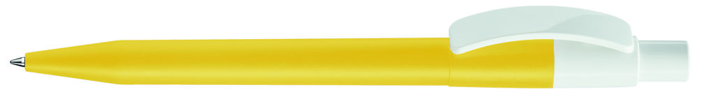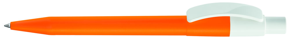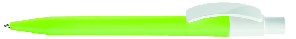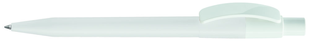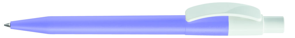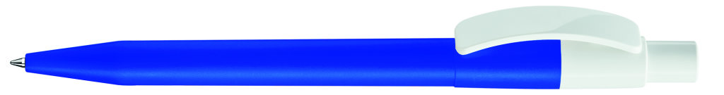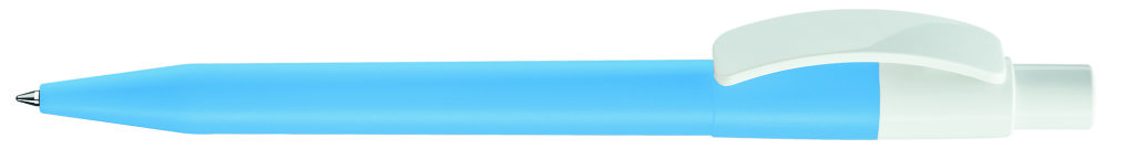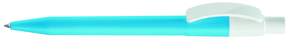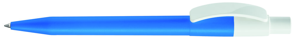 Druckkugelschreiber mit farbig mattem Gehäuse und glänzend weißem Bogenclip und Drücker. Minenfarbe: blau