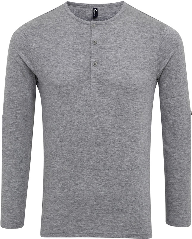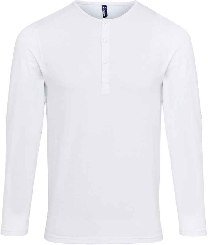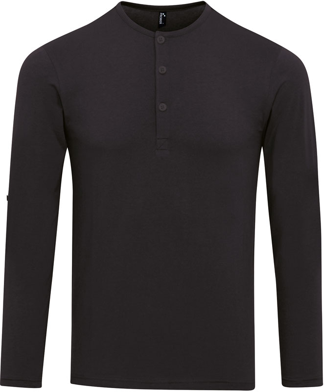 Herren Rollärmel T-Shirt langarm, Rundhalsausschnitt mit 3 Knöpfen, aufrollbare Ärmel mit Knopf und Riegel zu fixieren, Rippstrick Ärmelbündchen und Bündchen, Easy Care, 40° waschbar, nicht trocknergeeignet, Material: 190g/m², 82% Polyester, 14% Viskose, 4% Elasthan, Single Jersey, Größen: XS,S,M,L,XL,XXL,3XL