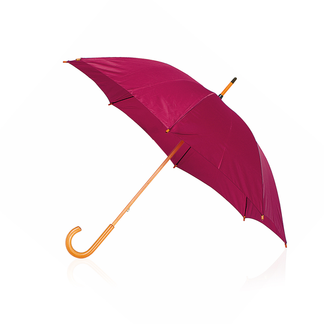 Regenschirm mit 8 Panelen aus Polyester. 105 cm Durchmesser, mit manueller Öffnung und schwarzen Metallstäben, Klettverschluss und geschmeidigem Holzgriff in Naturfarbe, in einer breiten Palette von leuchtenden Farben erhältlich.