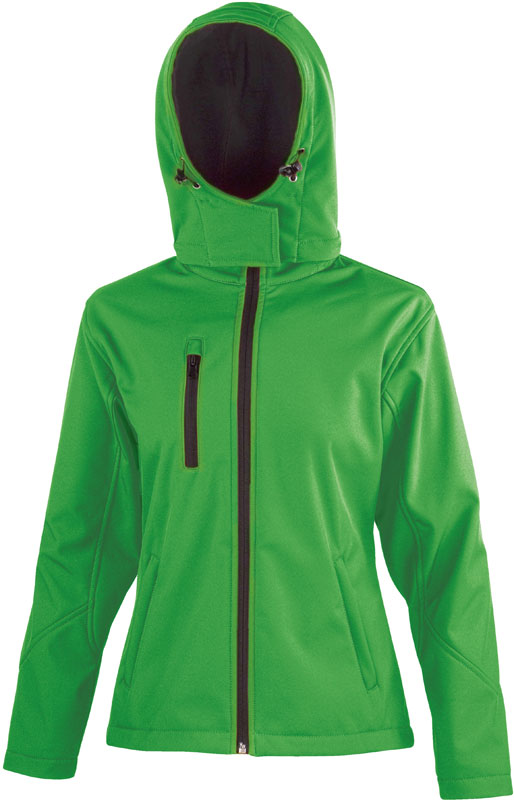 Damen 3-Lagen Softshell Kapuzenjacke, Taillierter Schnitt, wasserabweisend, 8.000mm Wassersäule, atmungsaktiv (1.000g/m² in 24h), abnehmbare Kapuze, YKK Reißverschluss mit Windblende innen, 2 seitliche Reißverschlüsse, 1 Brusttasche, Sattel im oberen Rückenbereich, länger geschnittener Rücken, Label zum Abschneiden, 40° waschbar, nicht bügeln, nicht trocknergeeignet, Material: 320g/m², 93% Polyester, 7% Elasthan, Mittelmembran, Innen: Microfleece, Größen: XS,S,M,L,XL,XXL