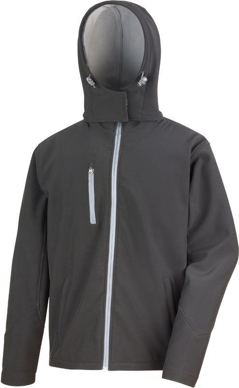 Herren 3-Lagen Softshell Kapuzenjacke, Wasserabweisend, 8.000mm Wassersäule, atmungsaktiv (1.000g/m² in 24h), abnehmbare Kapuze, YKK Reißverschluss mit Windblende innen, 2 seitliche Reißverschlüsse, 1 Brusttasche, Sattel im oberen Rückenbereich, länger geschnittener Rücken, Label zum Abschneiden, 40° waschbar, Schonwäsche, nicht bügeln, nicht trocknergeeignet, Material: 320g/m², 93% Polyester, 7% Elasthan, Mittelmembran, Innen: Microfleece, Größen: S,M,L,XL,XXL,3XL
