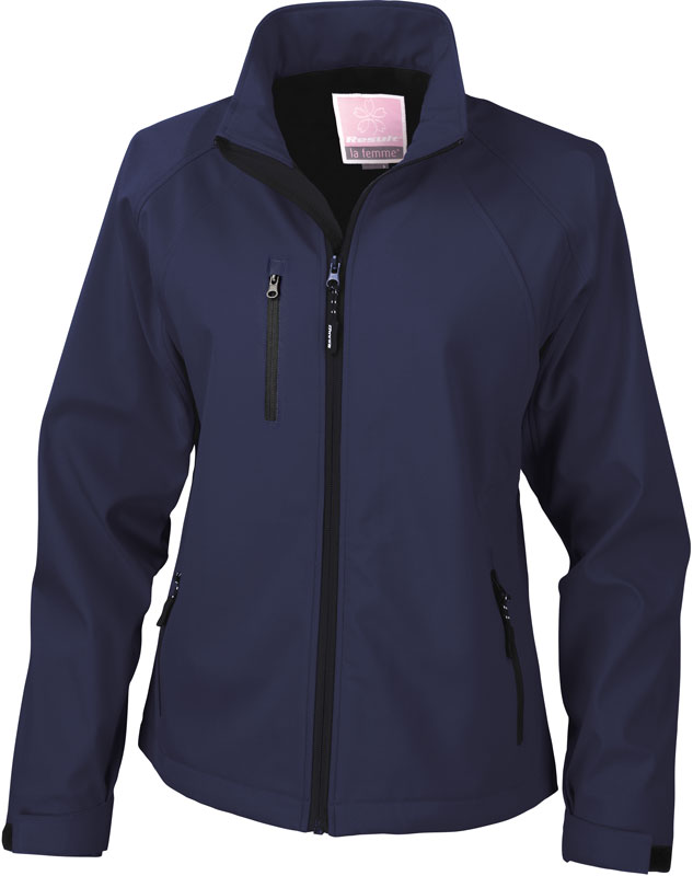 Damen 2-Lagen Softshell Jacke, Wasserabweisend, atmungsaktiv (1.000g/m² in 24h), verstellbare Ärmelbündchen mit Klettverschluss, Windblende innen, 1 Brusttasche mit Reißverschluss, 2 Seitentaschen mit Reißverschluss, Veredelungszugang an Rücken und linker Brust, weicher 2-Wege Stretchstoff, schnelltrocknend, winddicht, Material: 210g/m², 93% Polyester, 7% Spandex, Innen: 100% Polyester Netz, Größen: XS,S,M,L,XL,XXL