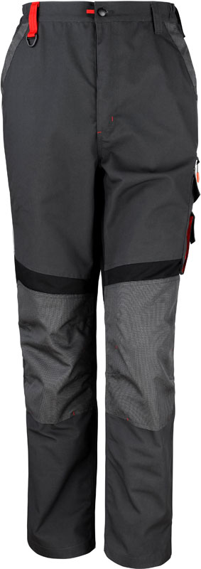Workwear Hose, Gürtelschlaufen, elastischer Bund, Kniepartie verstärkt, Handytasche und Zipptasche am linken Oberschenkel, 2 Taschen hinten, Cargotasche, Taschen an den Knien für Kniepolster, 2 Seitentaschen, 3-fach Nähte, Nähte verstärkt, schwarze Kontrasteinsätze und rote Details, winddicht, reflektierende Details (ohne Schutzfunktion), 60° waschbar, nicht trocknergeeignet, variable Beinlänge, Material: 270g/m², 65% Polyester, 35% Elasthan, Kontraststoff: 210g/m², 100% Polyester, Größen: S,M,L,XL,XXL,3XL,4XL,5XL