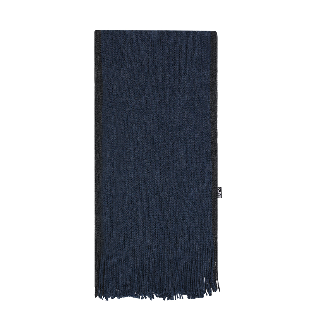 Weicher und warmer Schal aus warmem RPET-Polyester. In modischen zweifarbigen Farben mit verschiedenfarbigen Rändern, mit Fransen versehen. Mit RPET-Emblem auf dem Etikett. Einzeln verpackt in einer schwarzen Schachtel.Das RPET-Material wird aus recyceltem Kunststoff hergestellt, um die Wiederverwendung von Kunststoffabfällen zu fördern und die Nachhaltigkeit unseres Planeten zu unterstützen.