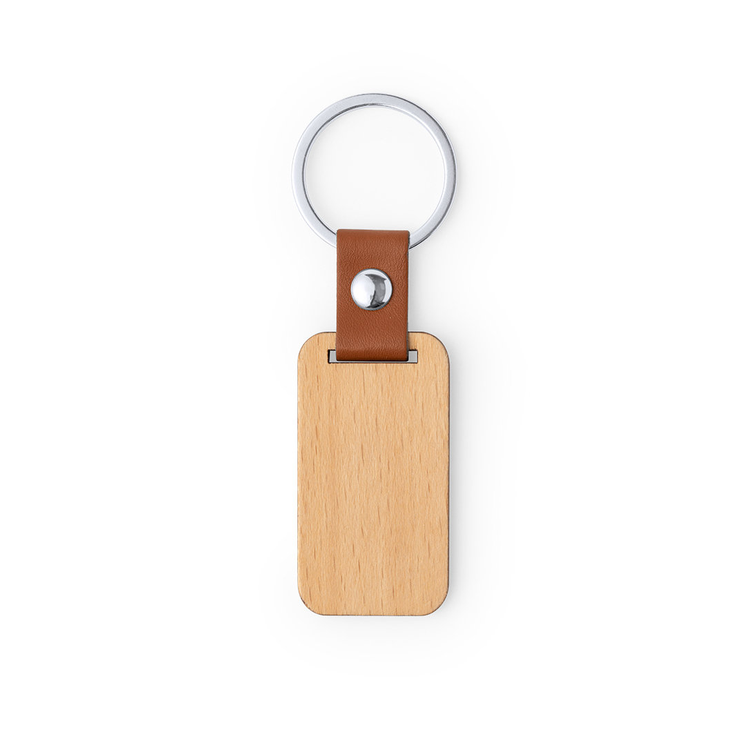 Schlüsselanhänger der Linie Natur aus Naturholz, mit original braunem PU-Lederband und Chromniete. Erhältlich in rechteckigem und rundem Design.