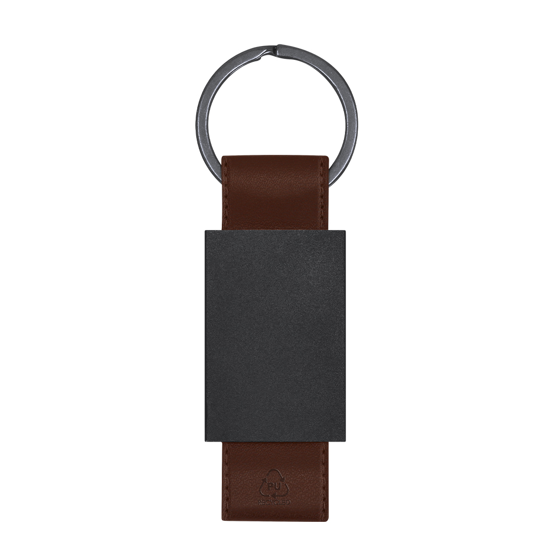 Spaßiger Design-Schlüsselanhänger mit recyceltem PU-Tape. Mit schwarzem Korpus in matter Lackierung.
