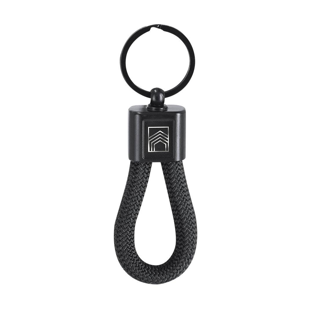 Eleganter Schlüsselanhänger mit Polyesterkordel. Enthält ein metallisiertes zentrales Teil, speziell für Lasermarkierung mit Spiegeleffekt entwickelt.