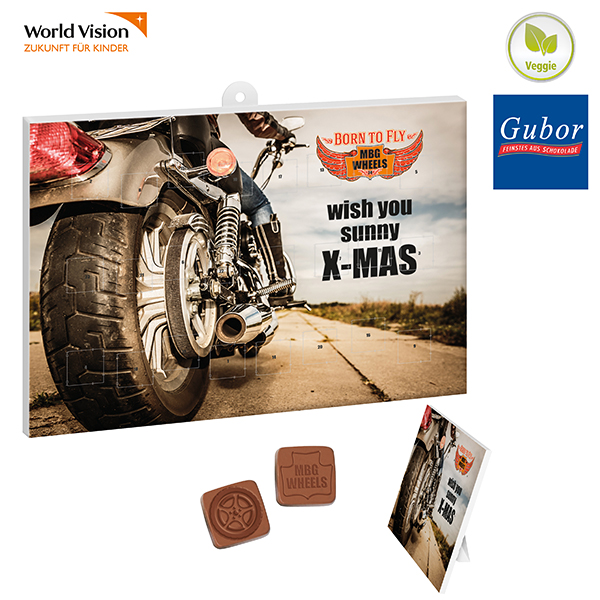 Wand- und Tisch-Adventskalender im Hoch- oder Querformat mit individuellem, stabilem Tiefziehteil, 3-fach verklebt, 24 Türchen gefüllt mit 1 – 24 individuellen Schokoladenmotiven. Mit jedem gekauften Kalender spenden Sie automatisch für World Vision-Projekte. Vollmilchschokolade mit mindestens 30 % Kakao.