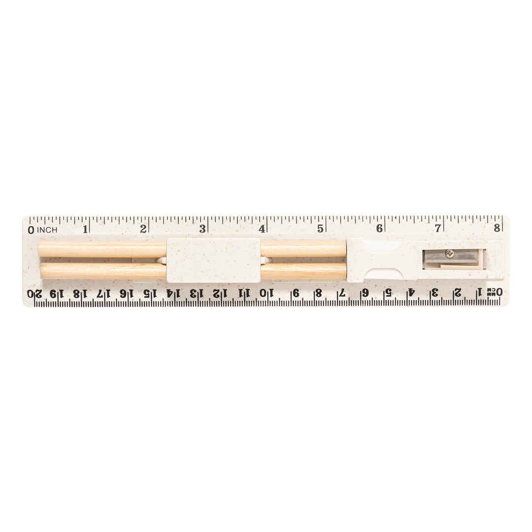 5-teiliges Set aus Weizenstroh. Inklusive 2 Holzstifte mit schwarzer Mine und weißem zylindrischen Körper; Radiergummi, und Spitzer. Präsentiert in einem Etui mit Lineal von 20 cm/8 Zoll, mit Fächern für die verschiedenen Elemente des Sets. Einzeln verpackt in einer weißen Papiertüte.Weizenstroh fördert die Verwendung von natürlichen Rohstoffen und reduziert so den Schadstoffausstoß.