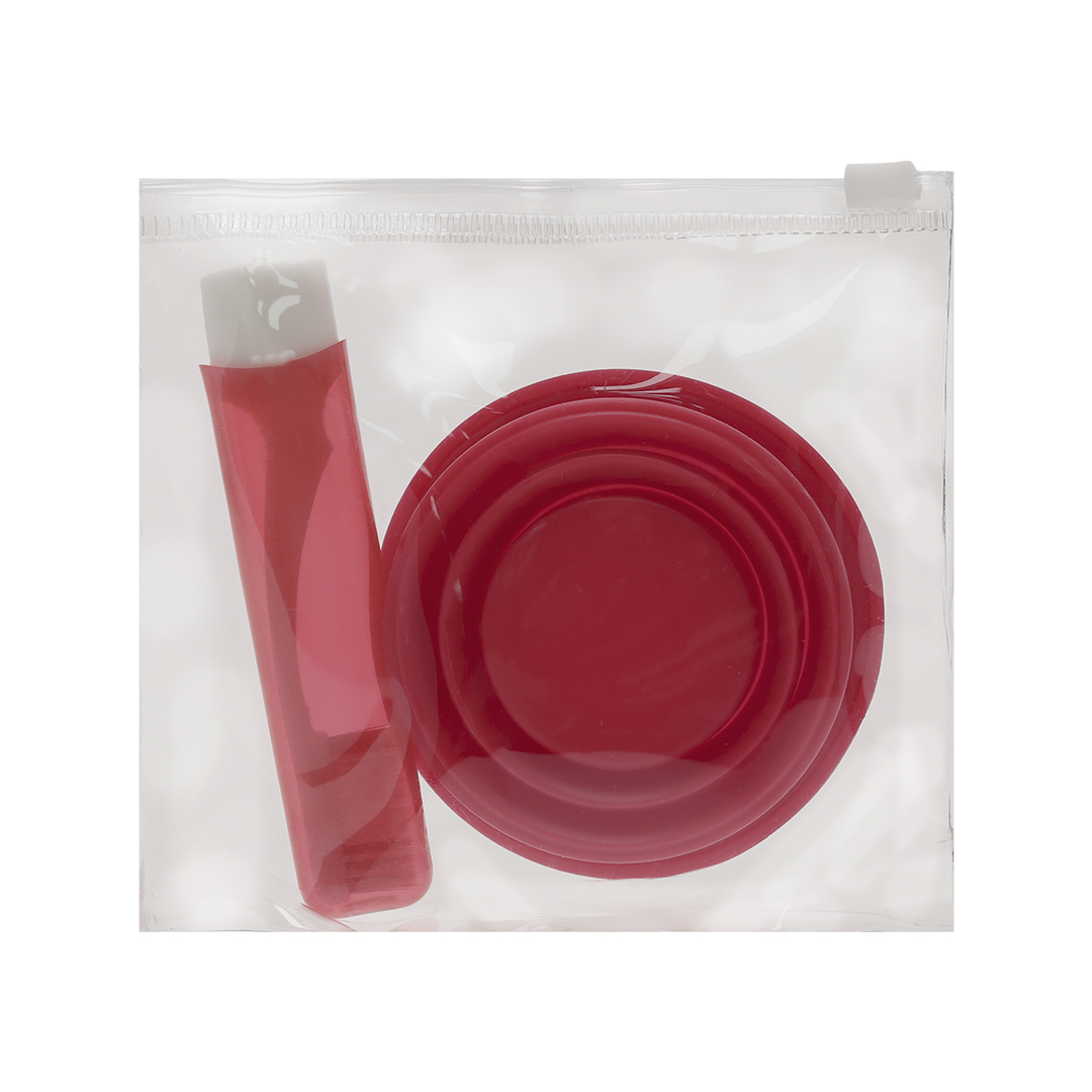 Satz Zahnbürste und Faltbecher. Enthält eine Zahnbürste aus faltbarem PP zur Platzverkleinerung und einen faltbaren Silikonbecher, präsentiert in einer transparenten PVC-Tüte mit Reißverschluss.