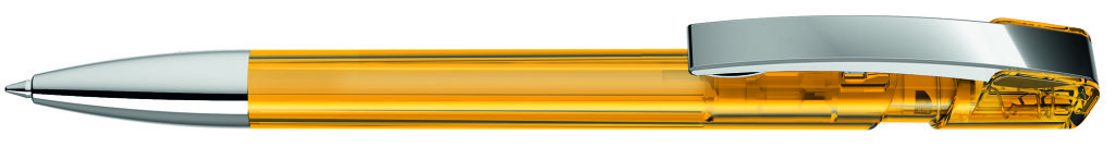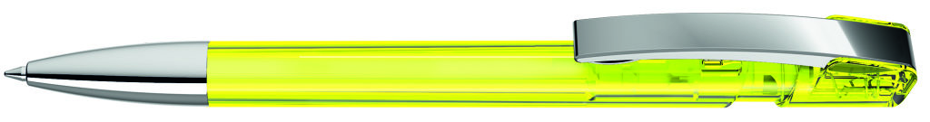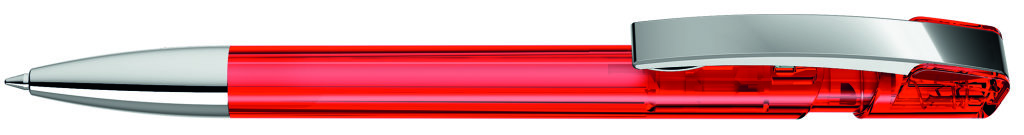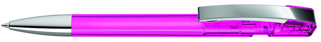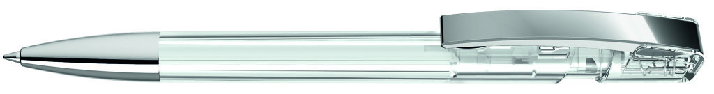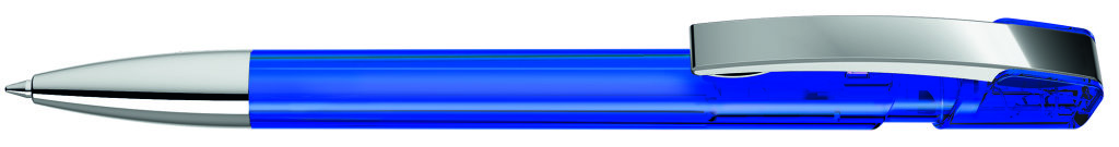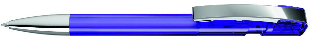 Druckkugelschreiber mit transparent glänzendem Gehäuse, flexiblem Metallclip und schwerer Metallspitze glanzverchromt. Minenfarbe: blau