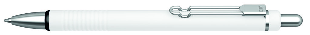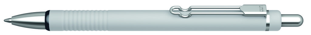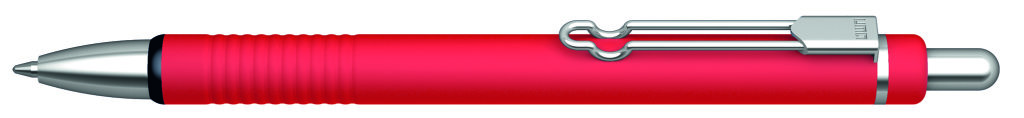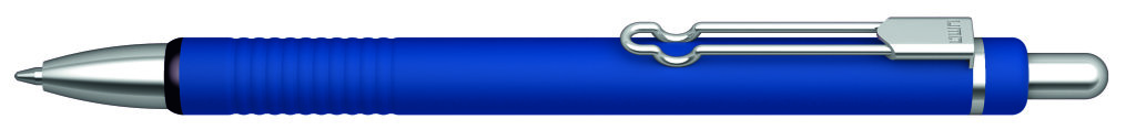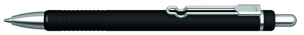Metall-Druckkugelschreiber mit matt lackiertem Aluminiumschaft und integrierter Griffzone. Metallbügelclip und Beschläge glanzverchromt. Zierring schwarz. Minenfarbe: blau
