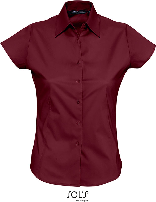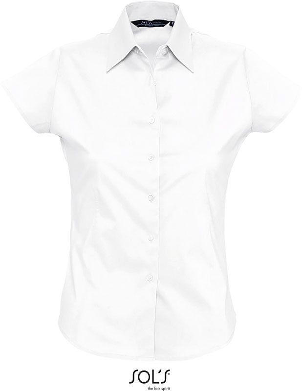 Stretch Bluse kurzarm, Taillierter Schnitt, Kragen mit einem Knopf, 7er Knopfleiste Ton-in-Ton, pflegeleicht, 40° waschbar, trocknergeeignet bei niedriger Temperatur, chemische Reinigung mit einem beliebigen Lösungsmittel außer Trichlorethylen, Material: 140g/m², 97% Baumwolle, 3% Elasthan, Größen: XS,S,M,L,XL,XXL