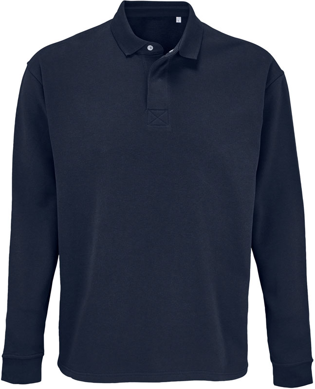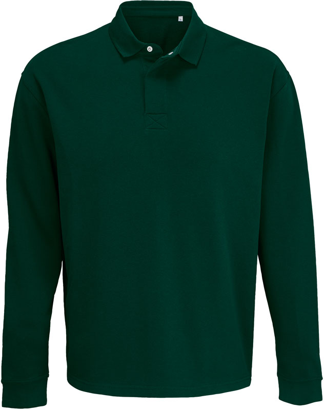 Polo Sweater, Gestrickter Polokragen, versteckte Druckknopfleiste, 1×1 Rippstrickbündchen mit Elasthan an den Ärmeln, Seitenschlitze, TearAway Label, neutrales Größenlabel, 60° waschbar, nicht bügeln, trocknergeeignet bei niedriger Temperatur, nicht chemisch reinigen, Material: 320g/m², 50% Baumwolle, 50% recycelte Baumwolle, French Terry (innen nicht angeraut), grey melange: 56% Baumwolle, 38% recycelte Baumwolle, 6% Viskose, Größen: XS,S,M,L,XL,XXL,3XL,4XL,5XL