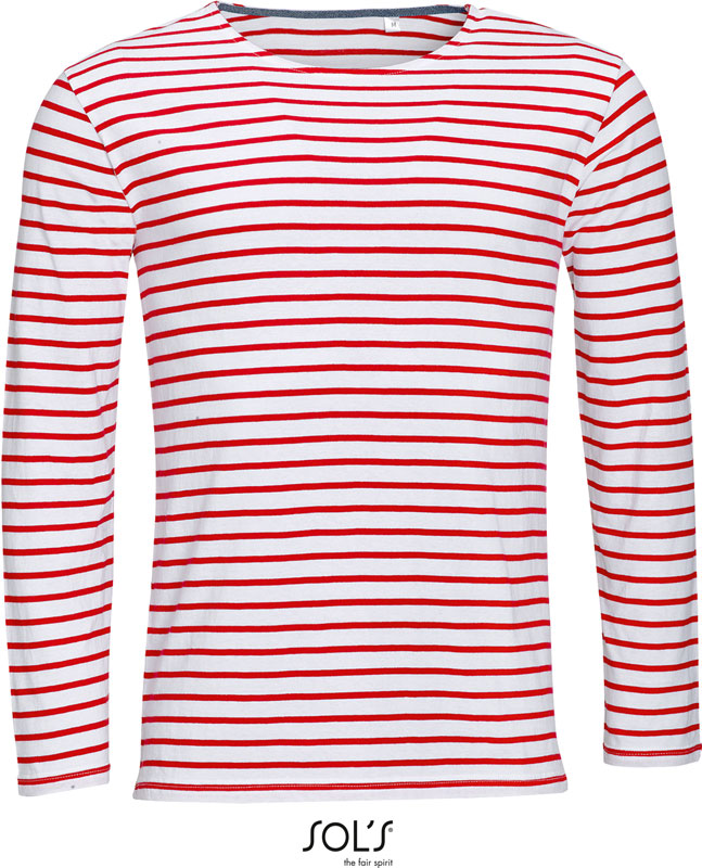 Herren T-Shirt langarm gestreift, Taillierter Schnitt, weiter Rundhalsausschnitt, Nackenband aus Chambray innen, schmale Ärmel, Streifen-Design, TearAway Label, neutrales Größenlabel, 40° waschbar, nicht trocknergeeignet, Material: 150g/m², 100% gekämmte ringgesponnene Baumwolle, Größen: S,M,L,XL,XXL