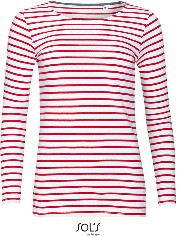 Damen T-Shirt langarm gestreift, Taillierter Schnitt, femininer Rundhalsausschnitt, Nackenband aus Chambray innen, Streifen-Design, TearAway Label, neutrales Größenlabel, 40° waschbar, nicht trocknergeeignet, Material: 150g/m², 100% gekämmte ringgesponnene Baumwolle, Größen: XS,S,M,L,XL,XXL