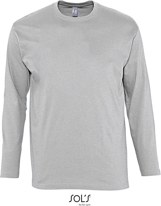 T-Shirt langarm, Rundstrickware, Rundhalsausschnitt aus Elasthan-Ripp, Nackenband, 40° waschbar, nicht trocknergeeignet, Material: 150g/m², 100% halbgekämmte ringgesponnene Baumwolle, grey melange: 85% Baumwolle, 15% Viskose, Größen: S,M,L,XL,XXL,3XL