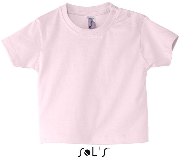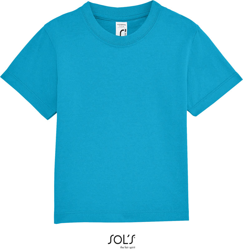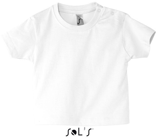 Baby T-Shirt, 1×1 Rippstrick Kragen, Nackenband, Öffnung an der linken Schulter mit 2 Druckknöpfen Ton-in-Ton, 40° waschbar, nicht trocknergeeignet, Material: 160g/m², 100% Baumwolle, Größen: 3-6,6-12,12-18,18-23
