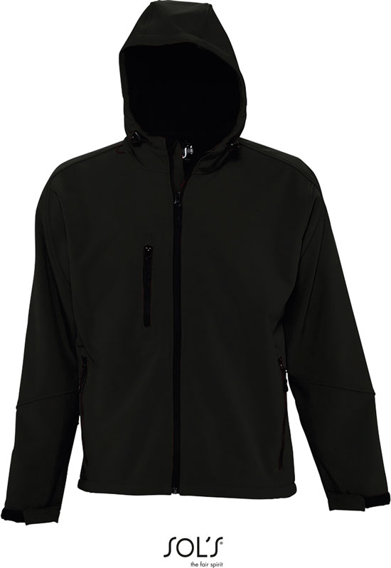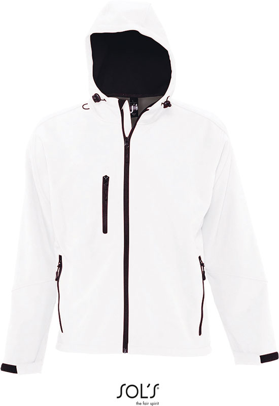 Kapuzen 3-Lagen Softshell Jacke, Wasserdicht (8.000mm Wassersäule), atmungsaktiv (1.000g/m² in 24h), Kapuze mit Zugkordel, verstellbare Klett-Bündchen, 2 Seitentaschen und 1 Reißverschluss-Brusttasche, an der Taille verstellbare Zugkordel, Veredelungszugang im Brustbereich, 40° waschbar, nicht trocknergeeignet, Material: 340g/m², 94% Polyester, 6% Elasthan, Größen: XS,S,M,L,XL,XXL,3XL