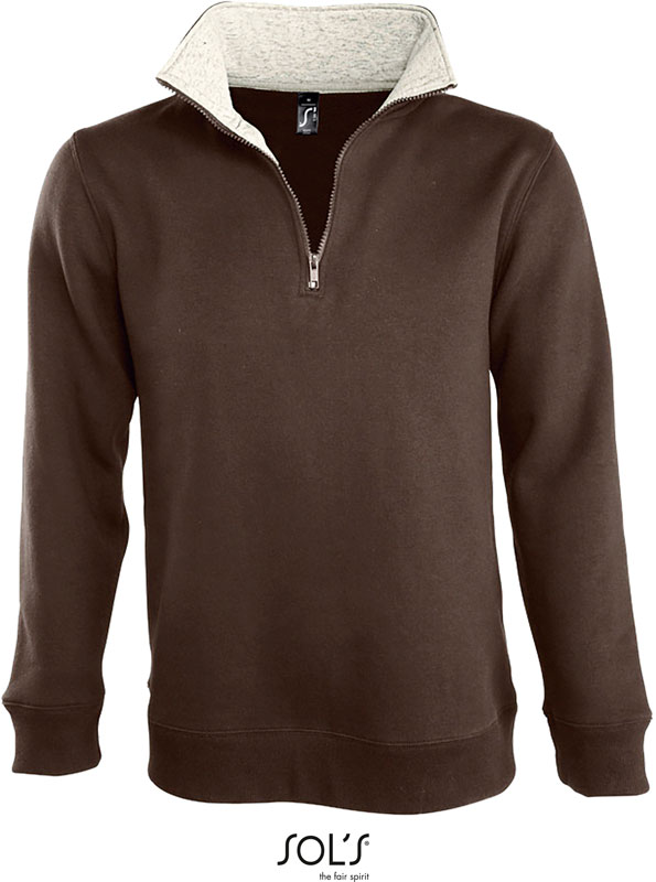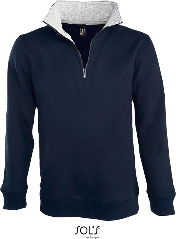 Sweater mit 1/4 Zip, Gefütterter Trucker-Kragen in Kontrastfarbe, Rippstrick am Bund mit Elasthan, 30° waschbar, nicht trocknergeeignet, Material: 280g/m², 50% ringgesponnene Baumwolle, 50% Polyester, Größen: S,M,L,XL,XXL
