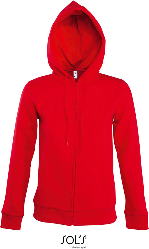 Damen Sweatjacke mit gefütterter Kapuze, Taillierter Schnitt, Kapuze mit Kordel und Stopper, Rippstrick am Bund mit Elasthan, 2 Kängurutaschen, innen angeraut, 30° waschbar, nicht trocknergeeignet, Material: 280g/m², 50% ringgesponnene Baumwolle, 50% Polyester, Größen: S,M,L,XL