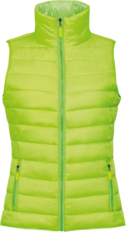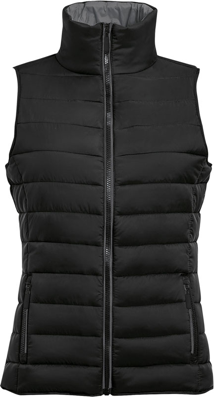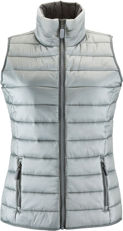 Leichter Damen Bodywarmer, Hoher Stehkragen, ohne Bund am Saum, 2 Seitentaschen passend zum Futter, 30° waschbar, nicht trocknergeeignet, Material: 100% Polyamid, Wattierung: 180g/m², 100% Polyester, Futter: 100% Polyamid, Größen: S,M,L,XL,XXL