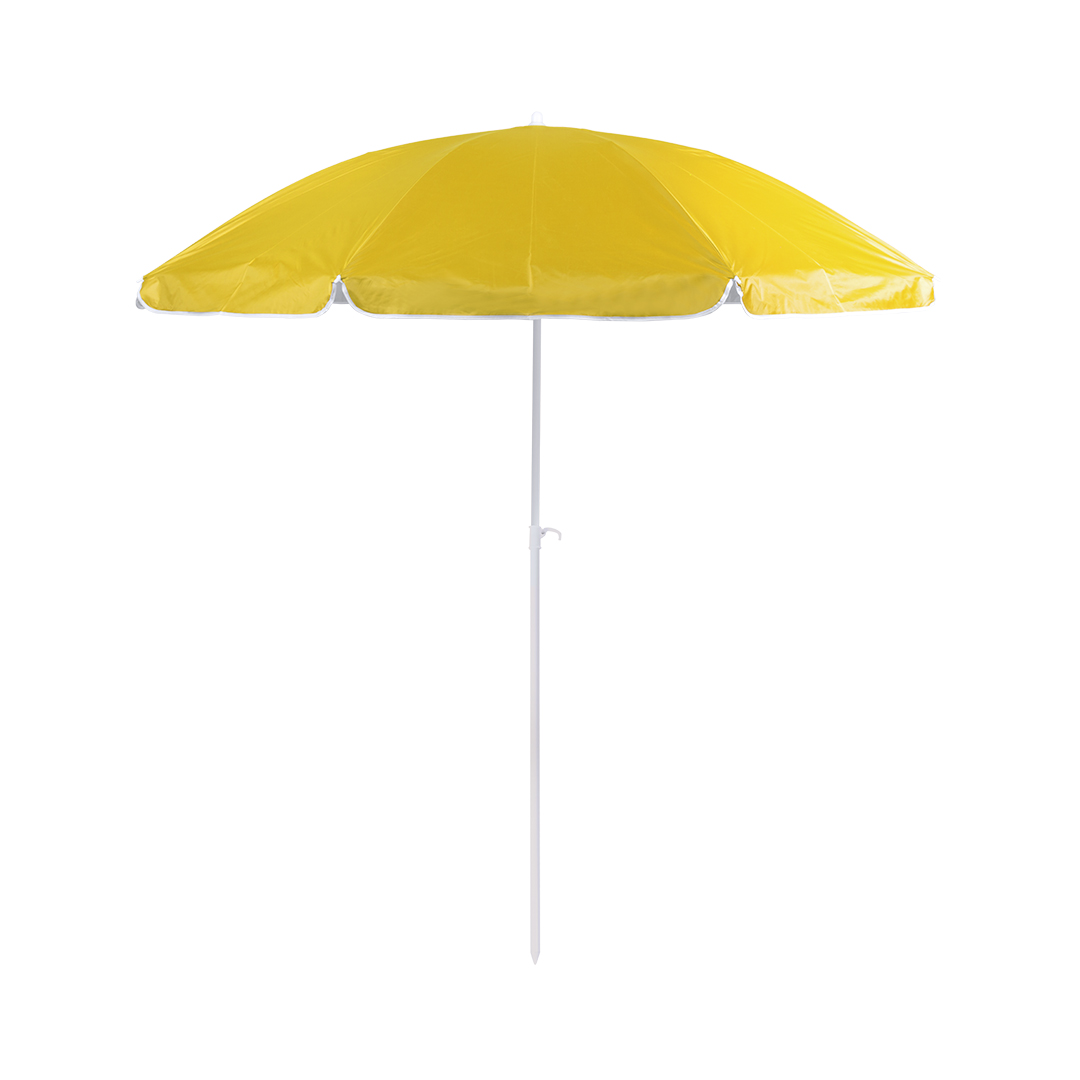 8-Panel-Strandschirm aus widerstandsfähigem Nylon mit silberner UV-Schutzschicht. Teleskopstange, höhen- und neigungsverstellbar. 200 cm Durchmesser, Seitenklappen mit Paspelierung und metallbeschichteten Rohren in weißer Farbe. In vielen leuchtenden Farben erhältlich, wird in einer Nylonhülle mit Schultergurt geliefert.