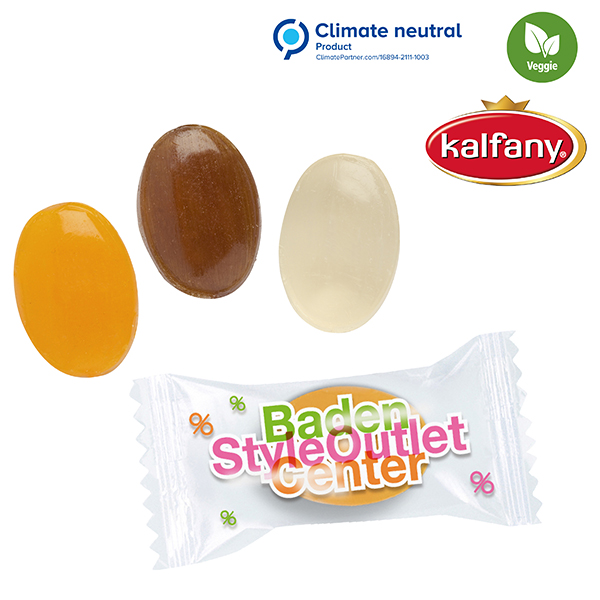 Bonbon in glänzend- oder matt-kaschiertem glasklarem alternativ weißem Flowpack einzeln verpackt.