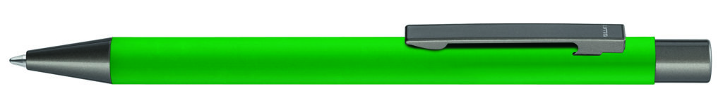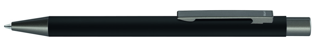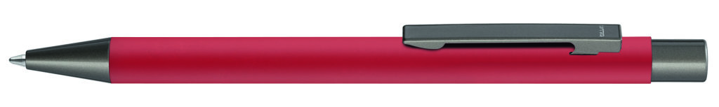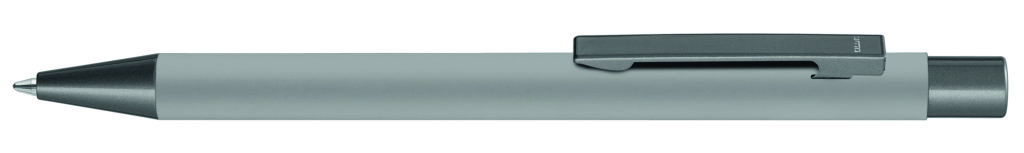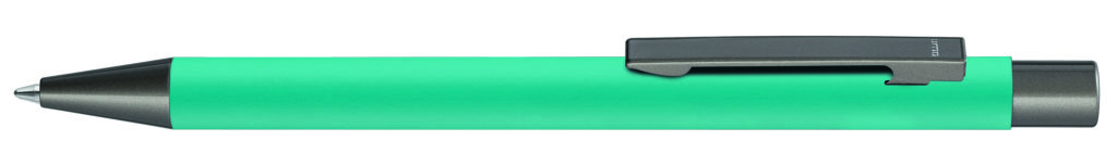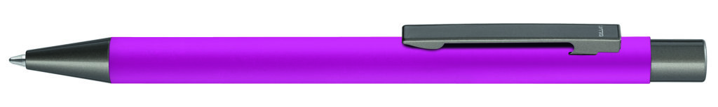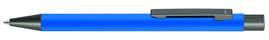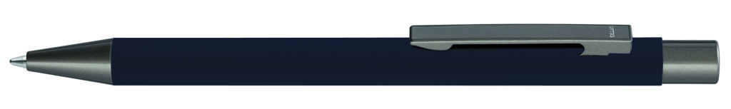 Metall-Druckkugelschreiber mit Softtouch-Gehäuse. Metallclip, Metallspitze und Drücker Gun metallic. Minenfarbe: blau