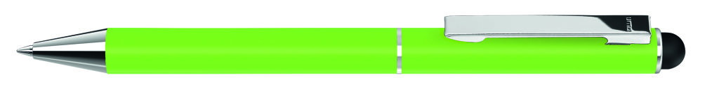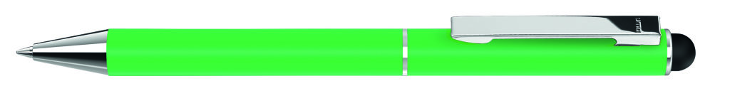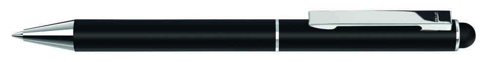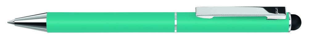 Metall-Drehkugelschreiber mit mattem Gehäuse. Metallclip und Metallspitze silber glänzend. Gummiertes Schaftende für die Touchscreensteuerung. Minenfarbe: blau