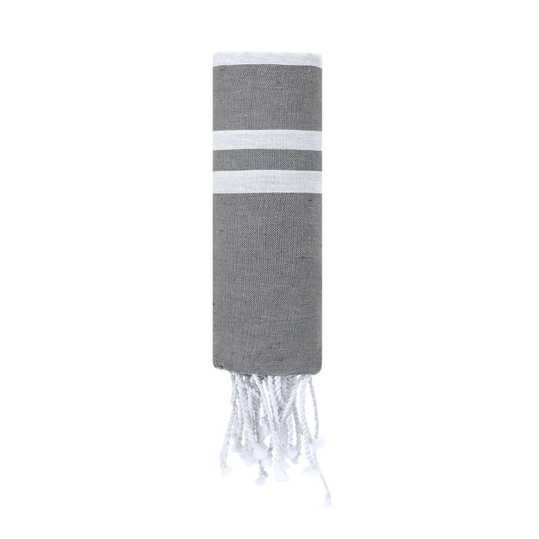 Weicher Pareo-Handtuch von 150 g/m2 in einer Kombination aus Baumwolle und Polyester. Sein Design hat einen bunten Hintergrund mit weißen Streifen. Enthält Fransen an den Enden, die ein dekoratives Detail hinzufügen und den Abschluss vervollständigen.