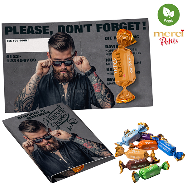 Faltkarte mit individuellem Außen- und Innenseitendruck und praktischer Abreißperforation, bestückt mit einem süßen Inhalt.